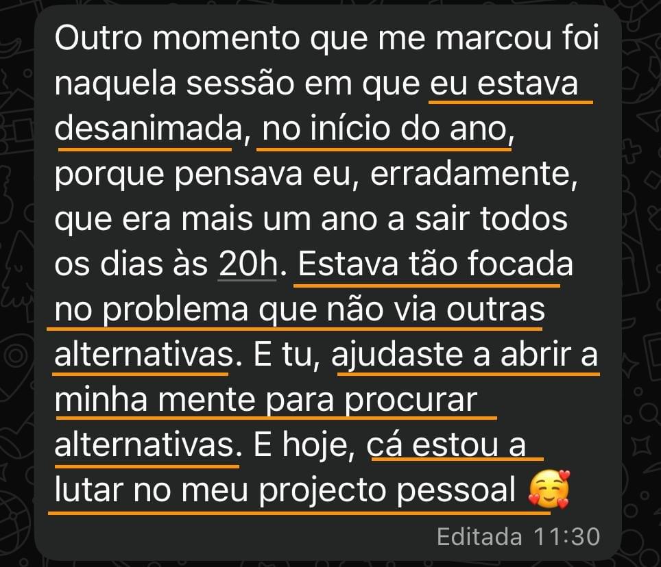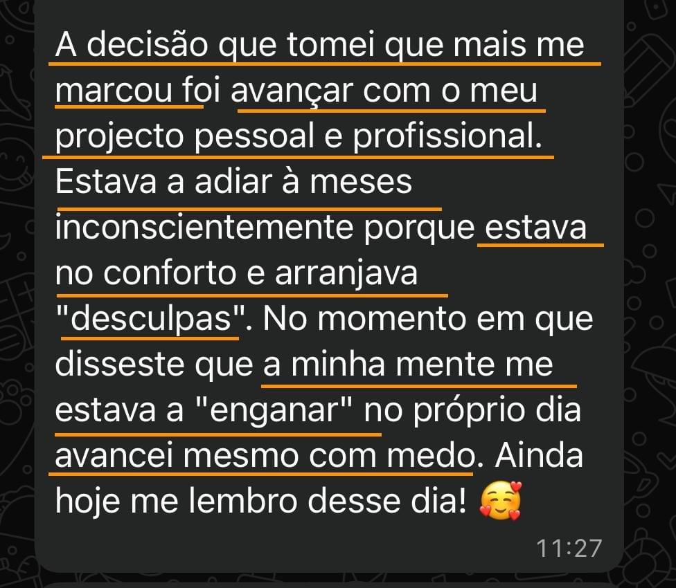 Eu passei de alguém com um trabalho seguro, que tinha dificuldade em acreditar em si, que preferia calar-se porque pensava para mim “não me sinto confiante o suficiente”, alguém que se sentia perdida sem saber que passos dar, o que fazer diferente, para alguém que hoje vive muito além dos seus sonhos mais ousados. Se estás pronto/a a acreditar em ti, este é o primeiro passo que precisas de dar.